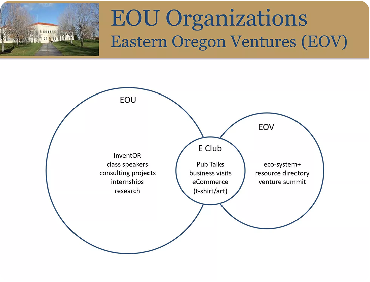 Student teams have performed research in the past on the state of the entrepreneurial ecosystem in eastern Oregon. The target of our research was the four counties along the I84 corridor in eastern Oregon (Morrow, Umatilla, Union, Baker). We have worked with the OEN and Eastern Oregon Ventures in the past to secure grant funding that will allow us to create and nurture the ecosystem. We have a good working partnership and there are state and federal funds available. The eClub will assist with grant proposals for several upcoming sources of funding.